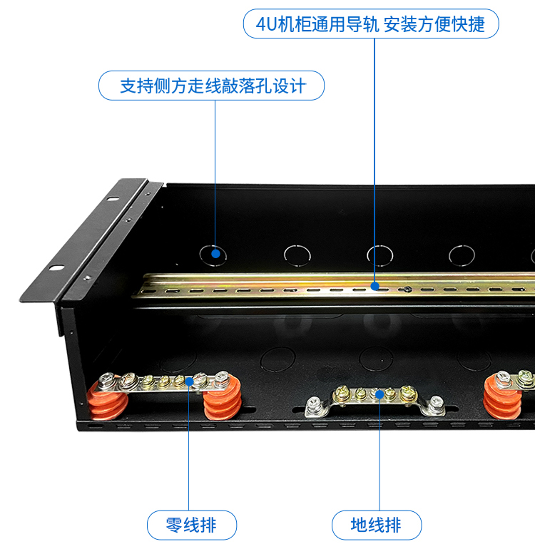 4U機柜配電箱采用通用導軌與側方走線敲落孔設計,方便安裝和維護。它可以容納更多的電子元件和線路,使得安裝過程更為簡潔。