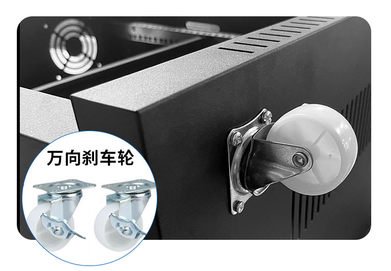 機柜配有靜音萬向輪,承重力強,含2個剎車輪,整體更穩(wěn)定,360°移動無死角